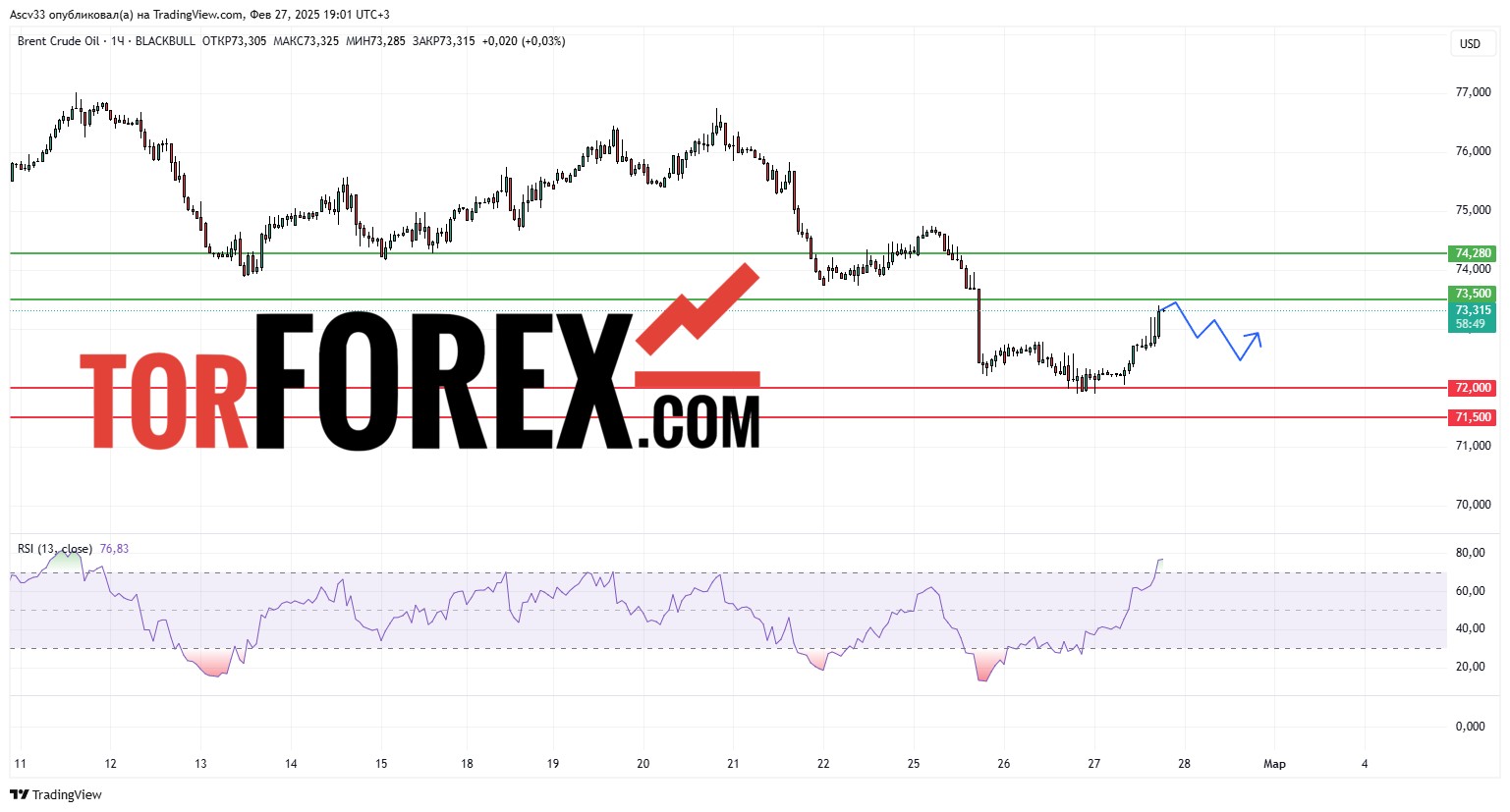 В ближайшие сутки нефть Brent, вероятно, будет колебаться в диапазоне $72,00–$73,50. Трейдерам рекомендуется внимательно следить за реакцией цены на указанные уровни поддержки и сопротивления. Пробой ниже $72,00 может усилить нисходящее движение, тогда как уверенный рост выше $73,50 может стать признаком разворота тренда.