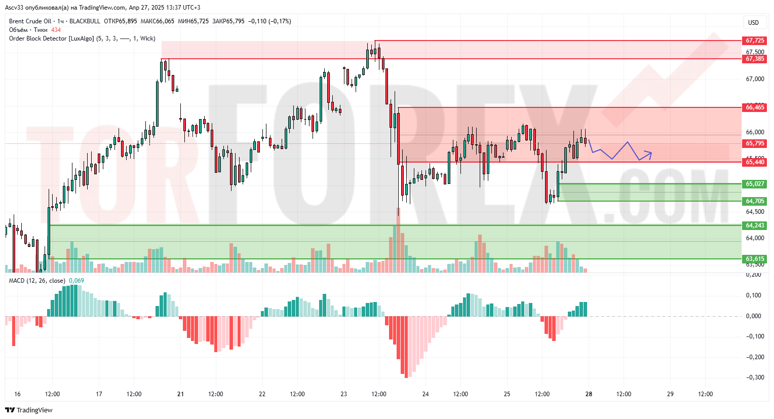 Цена нефти Brent зажата в широком диапазоне сопротивления 65.44–66.46. Попытки роста встречают активные продажи в пределах этой зоны. MACD показывает снижение импульса, что подтверждает отсутствие направленного тренда. Объёмы также умеренные, рынок переходит в стадию консолидации.