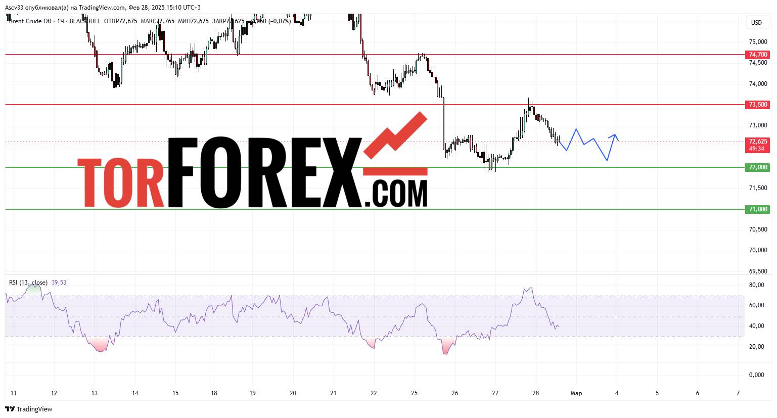 В ближайшие сутки нефть марки Brent, вероятно, продолжит движение в диапазоне $72,00–$73,50 за баррель. Трейдерам рекомендуется внимательно следить за реакцией цены на указанные уровни поддержки и сопротивления, поскольку их пробой может указать на дальнейшее направление движения.