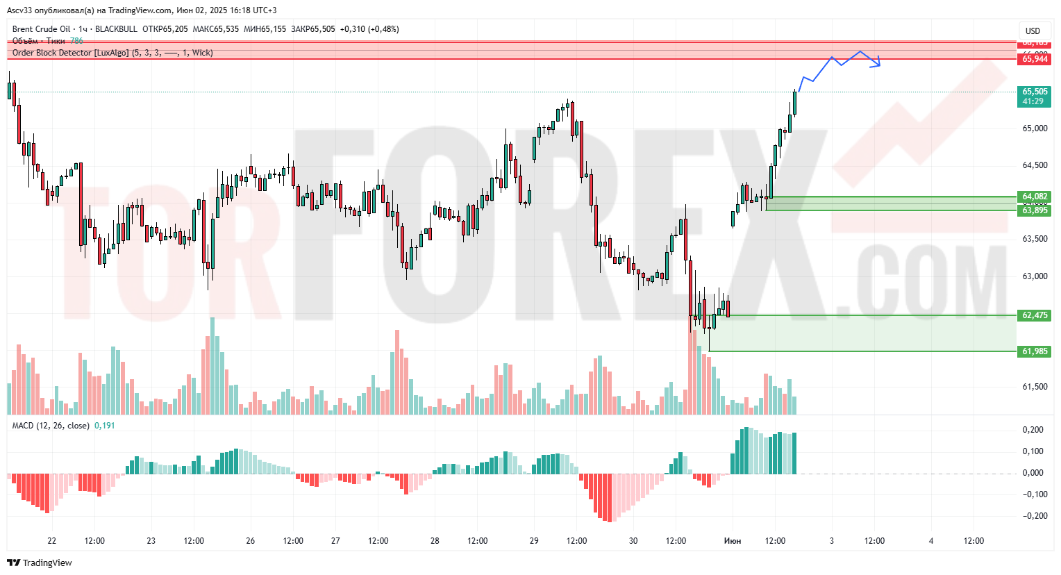 Вероятно, в ближайшее время Brent достигнет зоны 65.90–66.20 и там может начаться консолидация или откат. В случае фиксации выше 66.20 – возможен продолжение роста к 67.50. Поддержка 64.08 теперь ключевая для краткосрочного тренда.