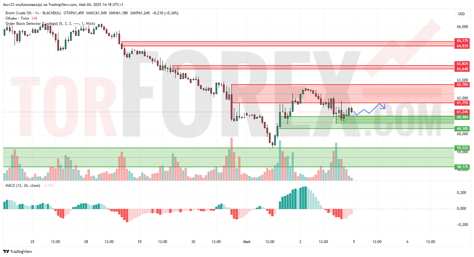 Цена на нефть Brent после глубокого падения отскочила от области спроса 59,2–60,3, но наткнулась на сопротивление в зоне 61,75–62,76. Пара формирует боковой диапазон на пониженных объёмах, что говорит об отсутствии чёткого импульса. MACD показывает ослабление бычьего импульса и возможный разворот вниз.