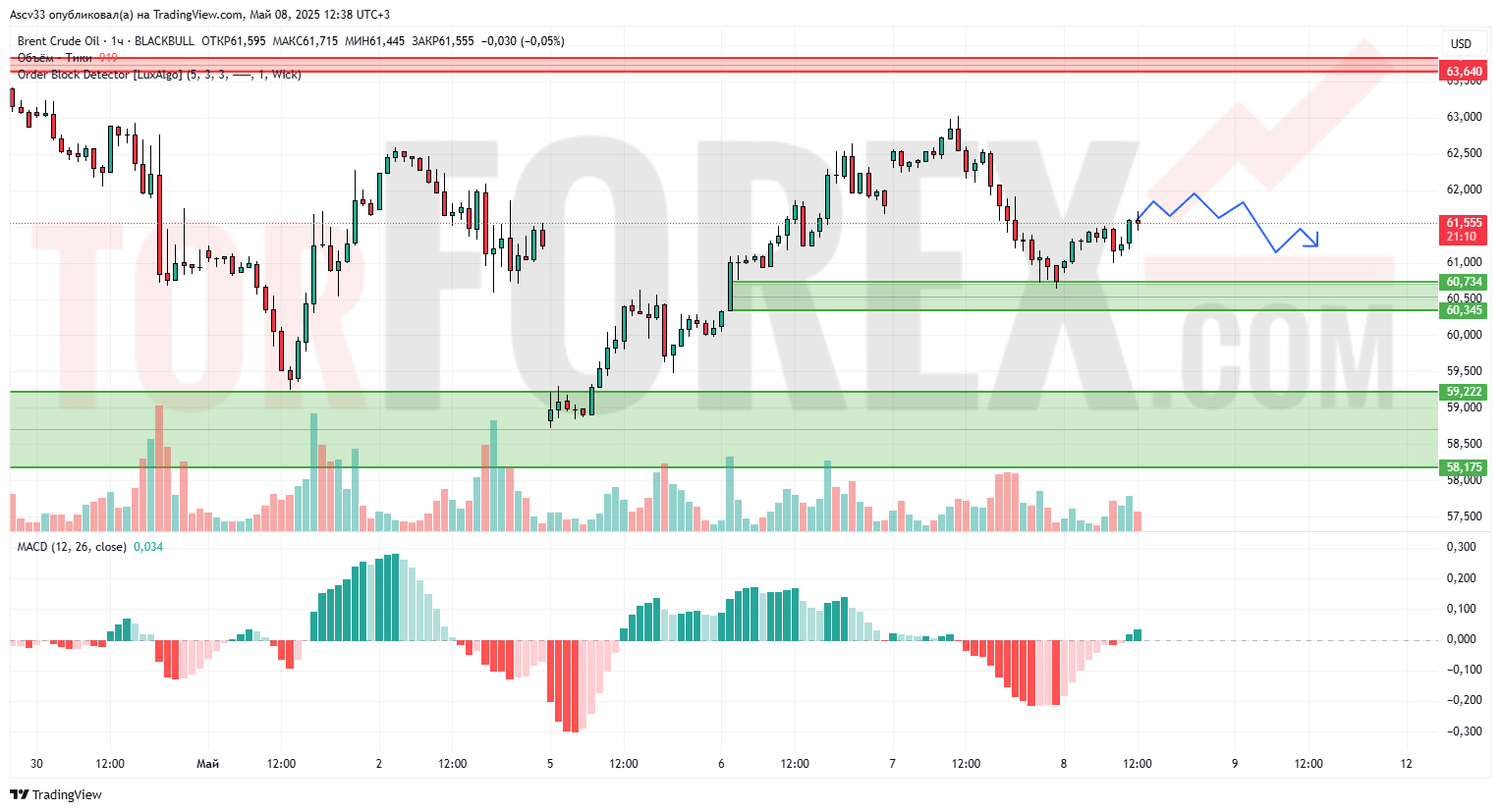 Вероятен сценарий консолидации с диапазоном 60,3–62,7. Устойчивый пробой выше 62,7 усилит бычий настрой с прицелом на 63,6. Однако при повторном тесте зоны спроса возможен возврат в область 60,3 и ниже.