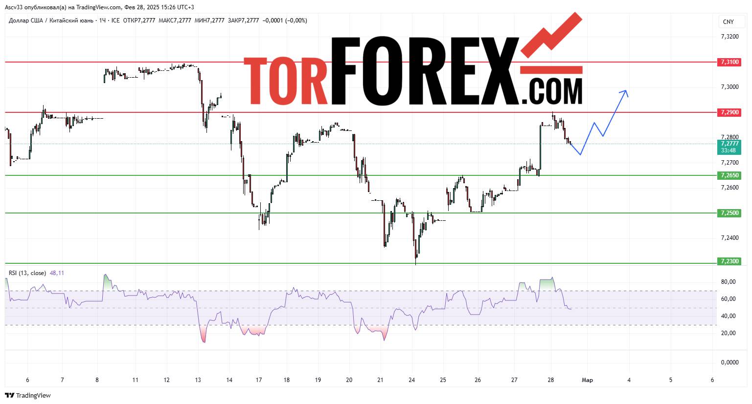 В ближайшие сутки пара USD/CNY, вероятно, продолжит движение в диапазоне 7,2500–7,3100. Трейдерам рекомендуется внимательно следить за реакцией цены на указанные уровни поддержки и сопротивления, поскольку их пробой может указать на дальнейшее направление движения.