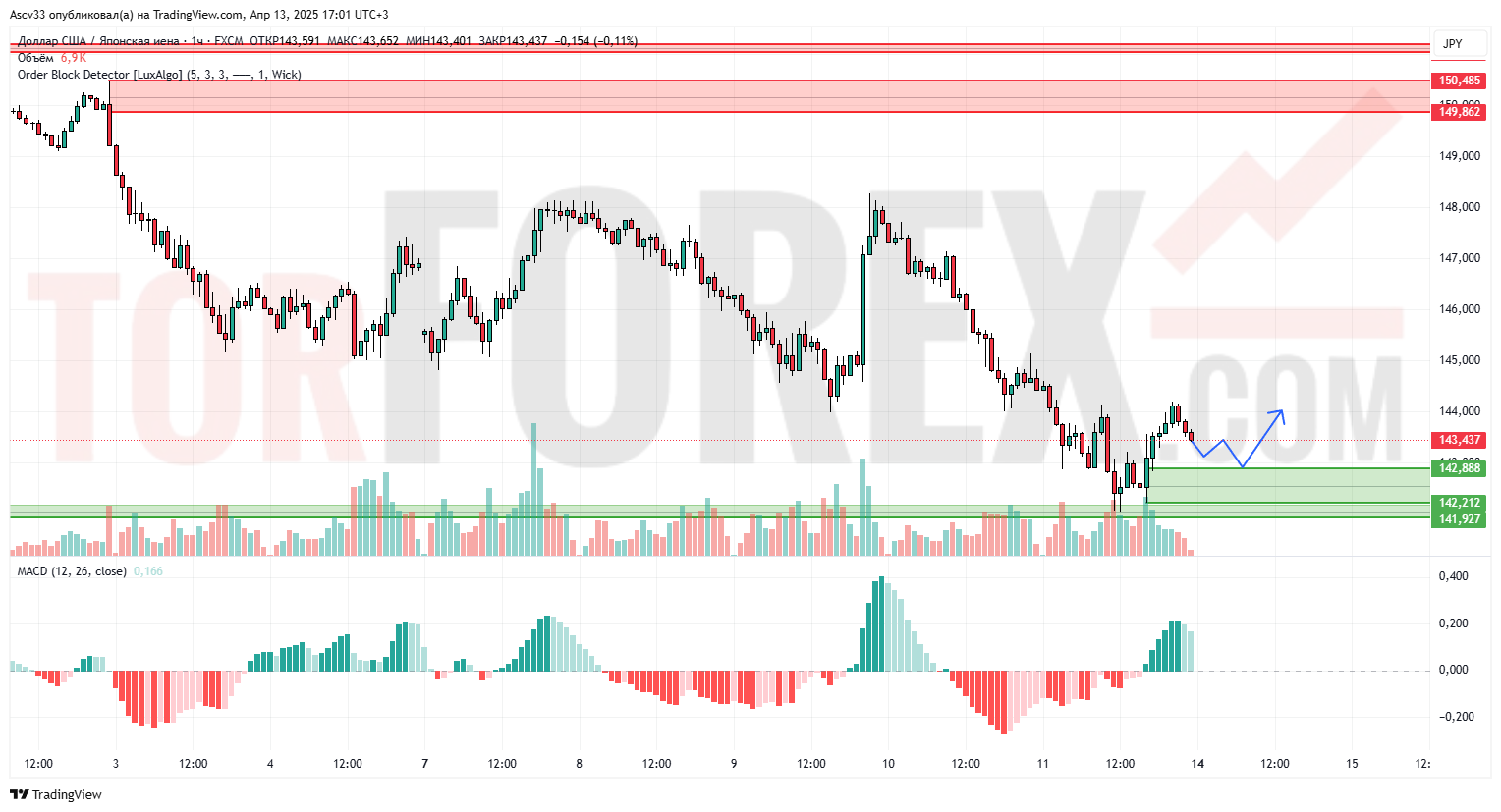 На часовом графике пара USD/JPY демонстрирует признаки формирования локального разворота вверх от зоны поддержки 141.90–142.20. После импульсного падения цена стабилизировалась и пробует отскочить вверх, подтверждая интерес покупателей в районе ключевой поддержки.