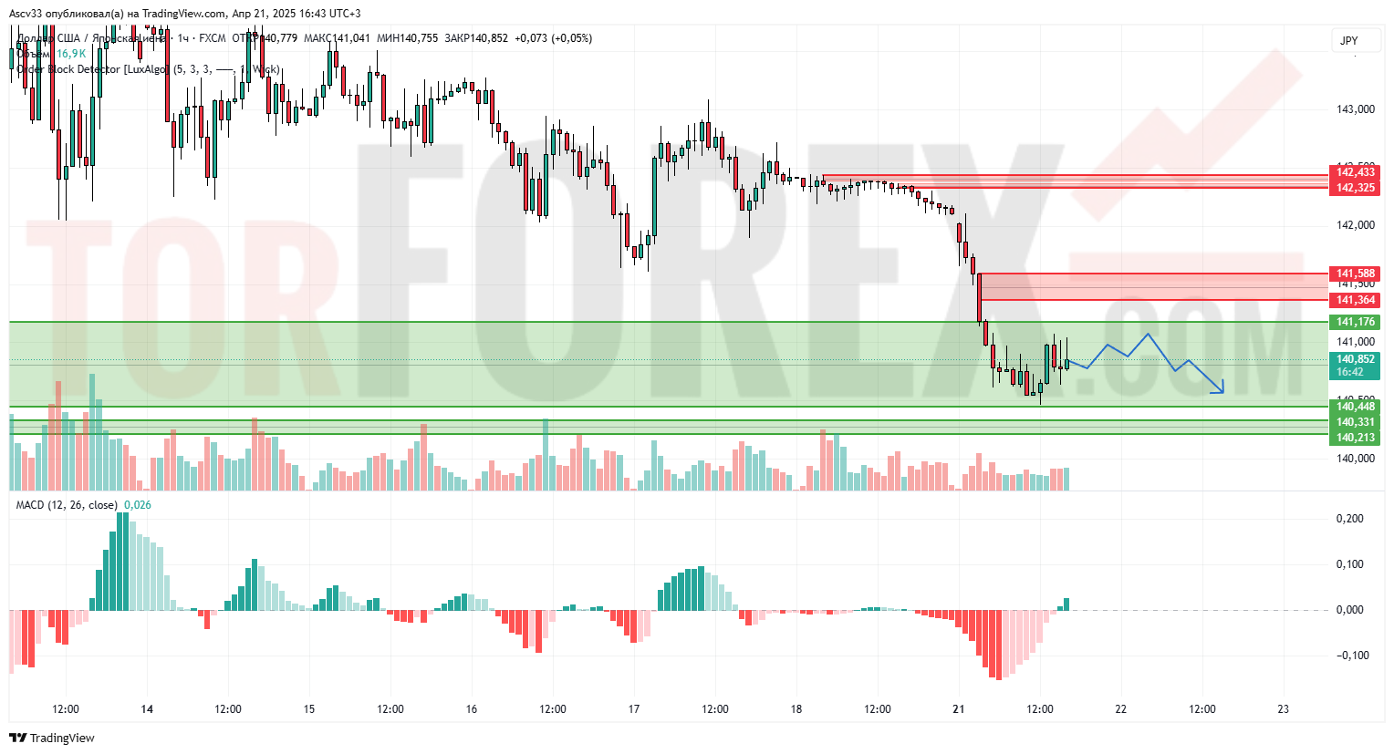 Пара USD/JPY после стремительного снижения стабилизировалась в зоне спроса 140.45–141.17. Наблюдается слабая попытка коррекции вверх, но структура рынка остаётся медвежьей. MACD начал разворачиваться в сторону покупок, но пока сигналы остаются слабыми. Объёмы на откате невысокие, что указывает на недостаток уверенности со стороны покупателей.