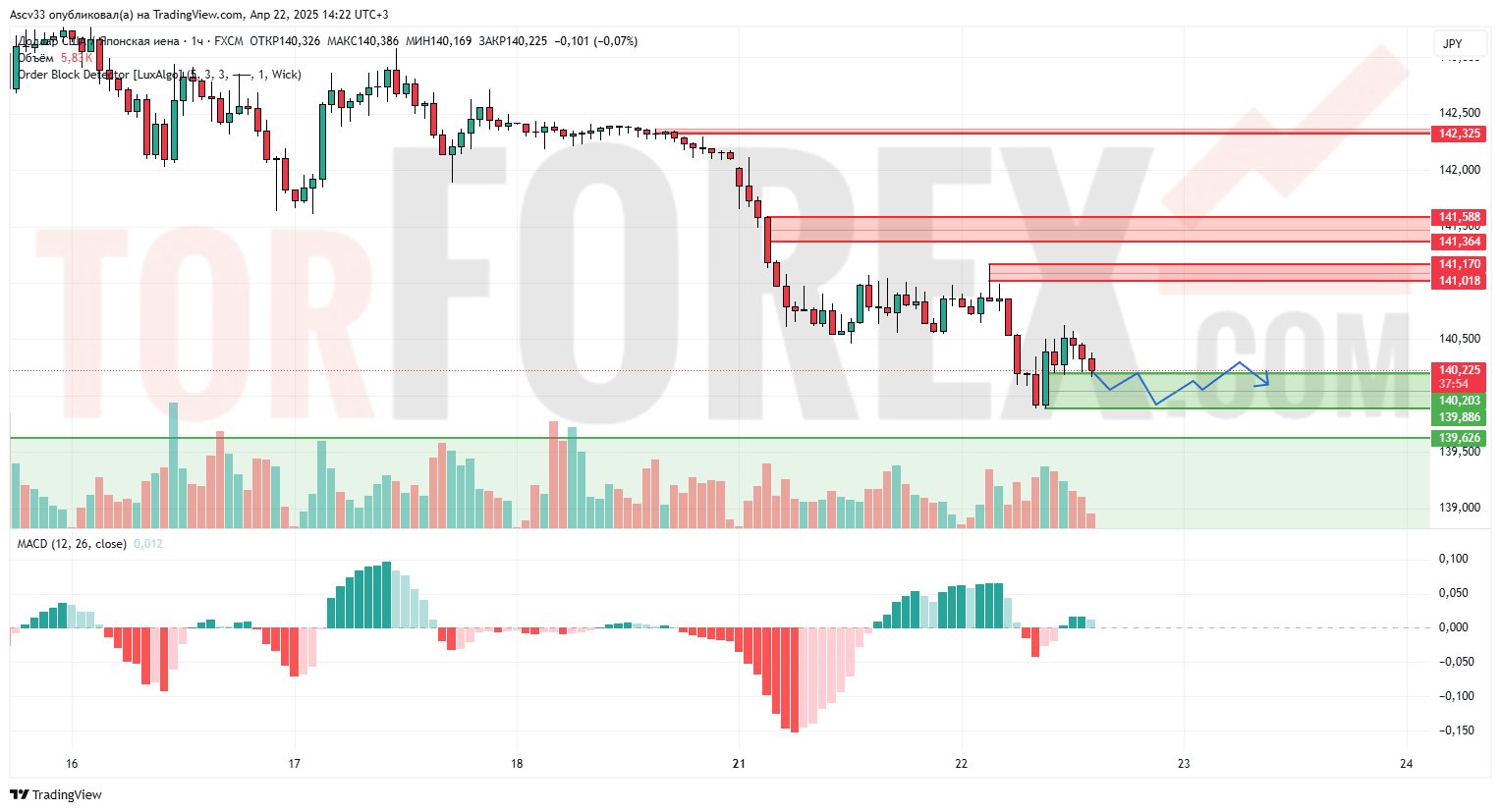 Пара USD/JPY продолжает консолидироваться вблизи локальной поддержки 140.20 после недавнего снижения. Наблюдается слабая попытка стабилизации, но структура остаётся медвежьей. MACD указывает на замедление нисходящего импульса, но пока нет признаков уверенного разворота. Объёмы остаются средними, что подтверждает фазу консолидации.