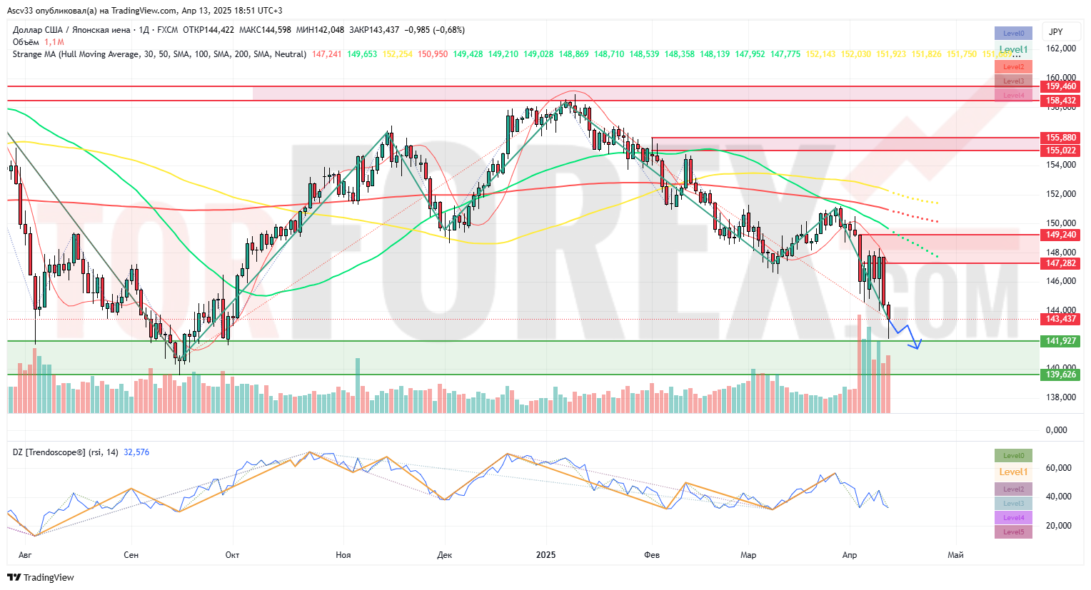 Пара USD/JPY продолжает движение в нисходящем канале, закрыв торговую сессию 13 апреля на уровне 143,44. Давление со стороны продавцов усилилось после неудачного теста уровня 149. Сигналы на графике указывают на возможность дальнейшего снижения к ключевым уровням поддержки.