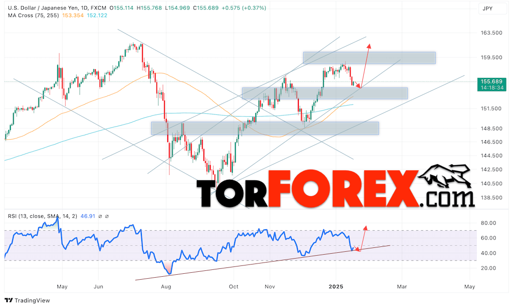 Дополнительным сигналом в пользу снижения валютной пары USD/JPY выступит тест линии тренда на индикаторе относительной силы. Вторым сигналом станет отскок от нижней границы восходящего канала. Отменой варианта подъёма валютной пары Доллар Иена станет падение и пробой уровня 152.85. Это укажет на пробой области поддержки и продолжение падения валютной пары Доллар Иена. В этом случае стоит ожидать продолжения снижения пары в область ниже уровня 149.75. Ожидать подтверждения росту цены стоит с пробоем уровня сопротивления и закреплением цены выше области 156.85.