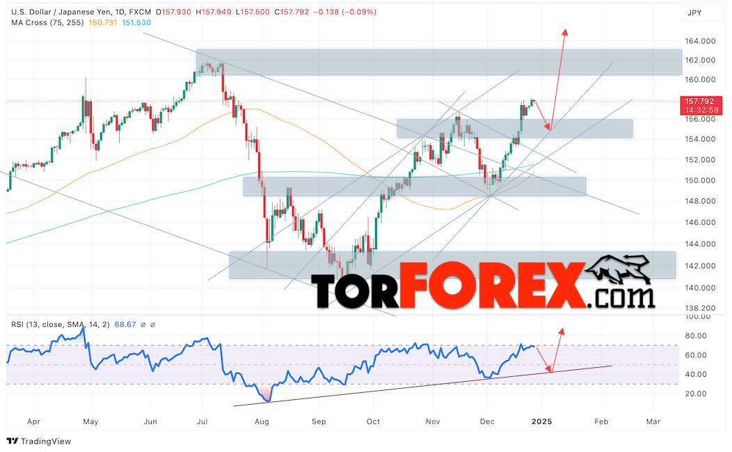 Котировки валютной пары Доллар Иена USDJPY завершает торговую неделю в рамках роста и восходящего канала. В момент публикации прогноза курс Доллара США к Японской Иене составляет 157.79. Скользящие средние указывают на наличие краткосрочной медвежьей тенденции по паре. Цены пробили область между сигнальными линиями вверх, что указывает на давление со стороны покупателей Доллара США и потенциальное продолжение роста цен уже с текущих уровней. В рамках прогноза курса Японской Иены на неделю стоит ожидать попытку развития снижения цены и тест области поддержки вблизи отметки 155.65. Далее, отскок цены вверх и продолжение роста пары USD/JPY в область выше уровня 164.25.