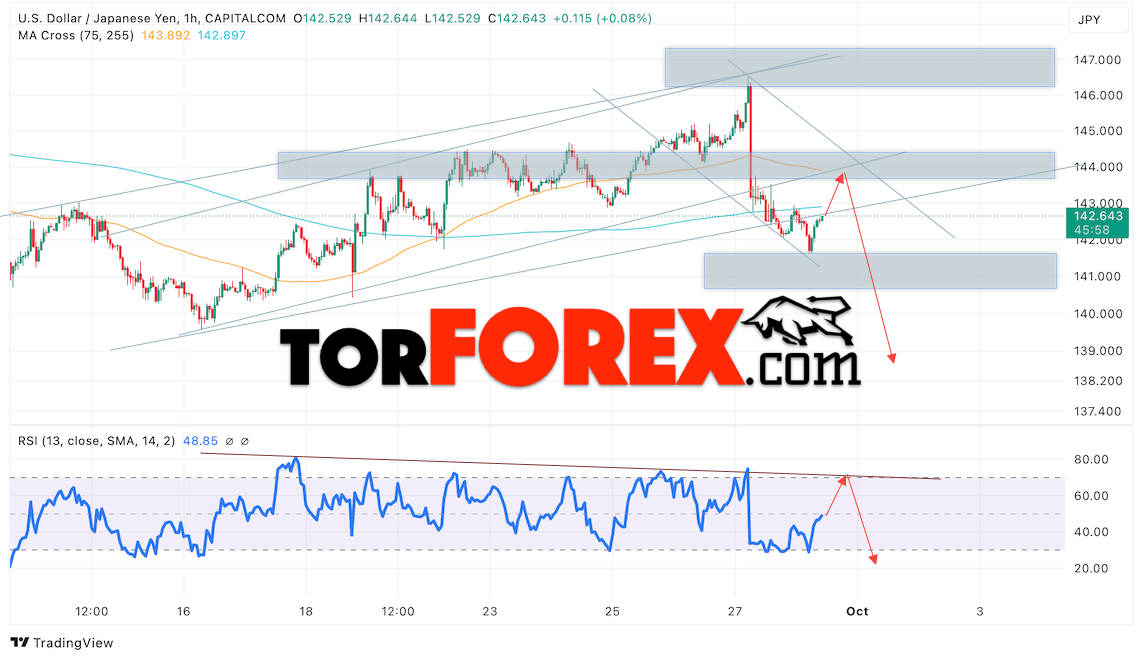 Котировки валютной пары Доллар Иена USDJPY продолжают движение в рамках развития коррекции после пробоя нижней границы бычьего канала. В момент публикации прогноза курс Доллара США к Японской Иене составляет 142.64. Скользящие средние указывают на наличие краткосрочной бычьей тенденции по паре. Цены пробили область между сигнальными линиями вниз, что указывает на давление со стороны продавцов Доллара США и потенциальное продолжение падения цен уже с текущих уровней. В рамках прогноза курса Японской Иены на 1 октября 2024 стоит ожидать попытку развития роста цены и тест области сопротивления вблизи уровня 143.55. Далее, отскок цены вверх и продолжение роста пары USD/JPY в область выше уровня 138.85.