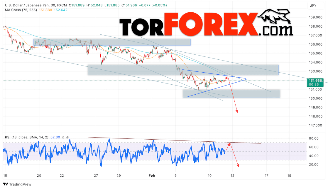 Котировки валютной пары Доллар Иена USDJPY продолжают движение в рамках развития коррекции и формирования модели «Треугольник». В момент публикации прогноза курс Доллара США к Японской Иене составляет 151.96. Скользящие средние указывают на наличие краткосрочной медвежьей тенденции по паре. Цены пробили область между сигнальными линиями вниз, что указывает на давление со стороны покупателей Доллара США и потенциальное продолжение роста цен уже с текущих уровней. В рамках прогноза курса Японской Иены на 12 февраля 2025 стоит ожидать попытку развития бычьей коррекции цены и тест области сопротивления вблизи уровня 152.35. Далее, отскок цены вниз и продолжение падения пары USD/JPY в область ниже уровня 148.65.