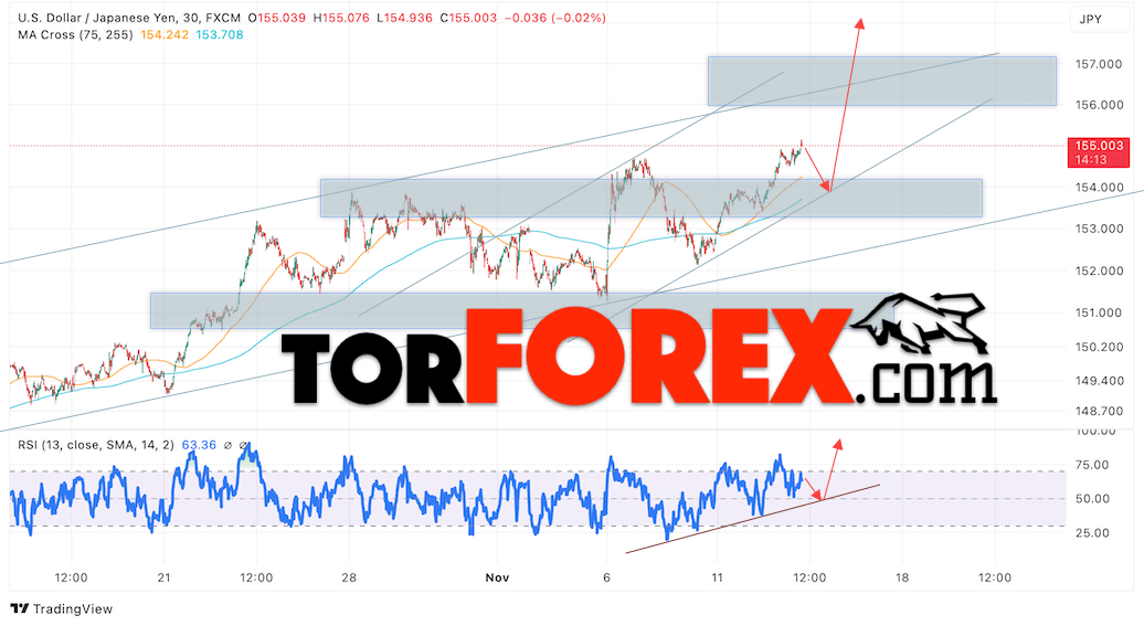 Котировки валютной пары Доллар Иена USDJPY продолжают движение в рамках развития роста и бычьего канала. В момент публикации прогноза курс Доллара США к Японской Иене составляет 155.00. Скользящие средние указывают на наличие краткосрочной бычьей тенденции по паре. Цены пробили область между сигнальными линиями вверх, что указывает на давление со стороны покупателей Доллара США и потенциальное продолжение роста цен уже с текущих уровней. В рамках прогноза курса Японской Иены на 14 ноября 2024 стоит ожидать попытку развития снижения цены и тест области поддержки вблизи уровня 153.95. Далее, отскок цены вверх и продолжение роста пары USD/JPY в область выше уровня 157.75.