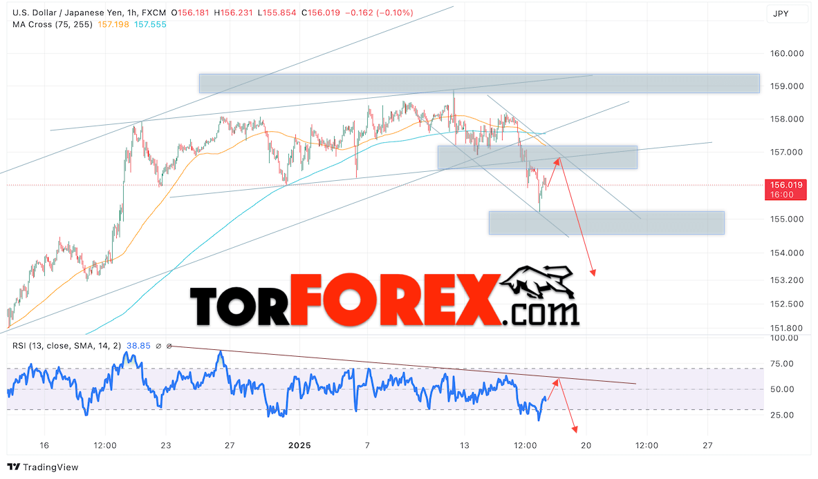 Котировки валютной пары Доллар Иена USDJPY продолжают движение в рамках падения и покинула пределы бычьего канала. В момент публикации прогноза курс Доллара США к Японской Иене составляет 156.01. Скользящие средние указывают на наличие краткосрочной медвежьей тенденции по паре. Цены пробили область между сигнальными линиями вниз, что указывает на давление со стороны продавцов Доллара США и потенциальное продолжение падения цен уже с текущих уровней. В рамках прогноза курса Японской Иены на 17 января 2025 стоит ожидать попытку развития роста цены и тест области сопротивления вблизи уровня 156.85. Далее, отскок цены вниз и продолжение падения пары USD/JPY в область ниже уровня 153.25.