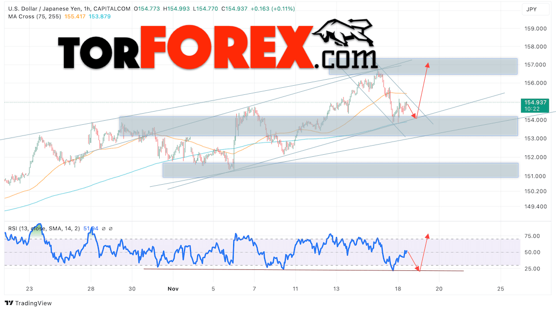 Котировки валютной пары Доллар Иена USDJPY продолжают движение в рамках развития восходящего импульса и бычьего канала. В момент публикации прогноза курс Доллара США к Японской Иене составляет 154.93. Скользящие средние указывают на наличие краткосрочной бычьей тенденции по паре. Цены тестируют область между сигнальными линиями, что указывает на давление со стороны покупателей Доллара США и потенциальное продолжение роста цен уже с текущих уровней. В рамках прогноза курса Японской Иены на 19 ноября 2024 стоит ожидать попытку развития медвежьей коррекции цены и тест области поддержки вблизи уровня 154.05. Далее, отскок цены вверх и продолжение роста пары USD/JPY в область выше уровня 156.95.