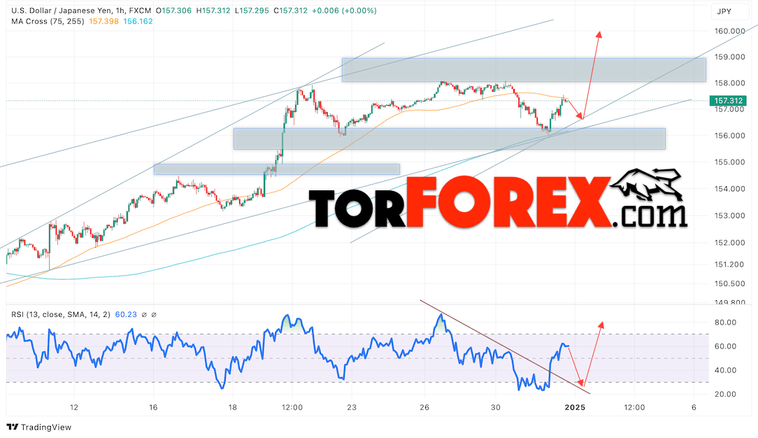 Котировки валютной пары Доллар Иена USDJPY продолжают движение в рамках развития роста и бычьего канала. В момент публикации прогноза курс Доллара США к Японской Иене составляет 157.31. Скользящие средние указывают на наличие краткосрочной медвежьей тенденции по паре. Цены вновь тестируют область между сигнальными линиями, что указывает на давление со стороны продавцов Доллара США и потенциальное продолжение падения цен уже с текущих уровней. В рамках прогноза курса Японской Иены на 2 января 2025 стоит ожидать попытку развития снижения цены и тест области поддержки вблизи уровня 156.75. Далее, отскок цены вверх и продолжение роста пары USD/JPY в область выше уровня 160.05.