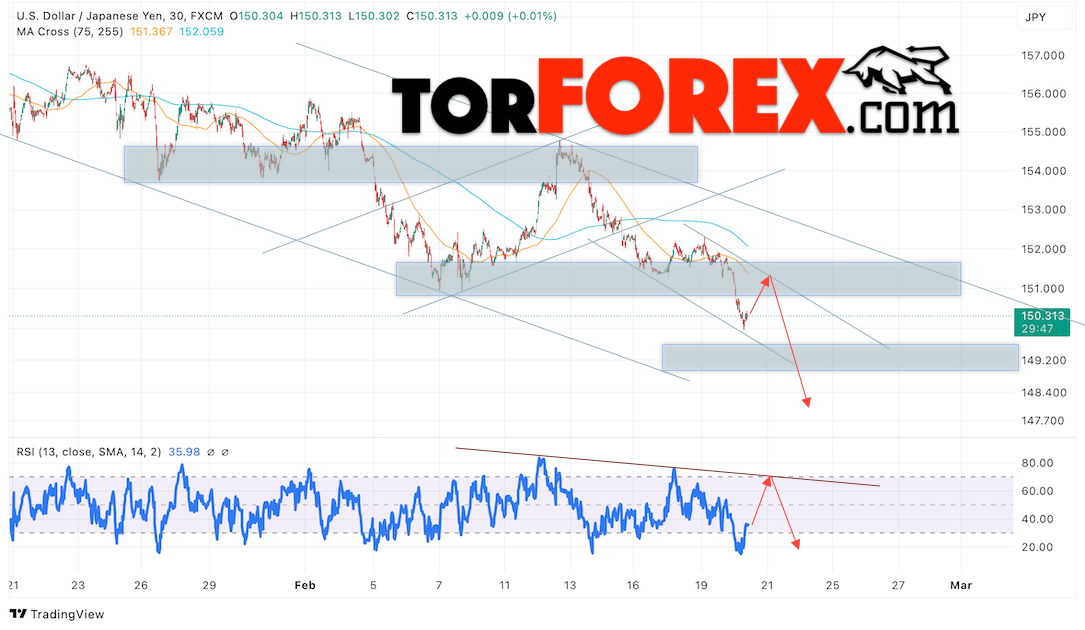 Таким образом, Японская Иена прогноз на сегодня 21 февраля 2025 предполагает попытку развития бычьей коррекции и тест области сопротивления вблизи уровня 151.25. Затем, продолжение падения котировок в область ниже отметки 148.25. В пользу снижения валютной пары выступит тест линии сопротивления на индикаторе относительной силы. Отменой варианта падения станет сильный рост и пробой области 152.35. Это укажет на пробой уровня сопротивления и продолжение роста по паре с потенциальной целью выше отметки 152.75.