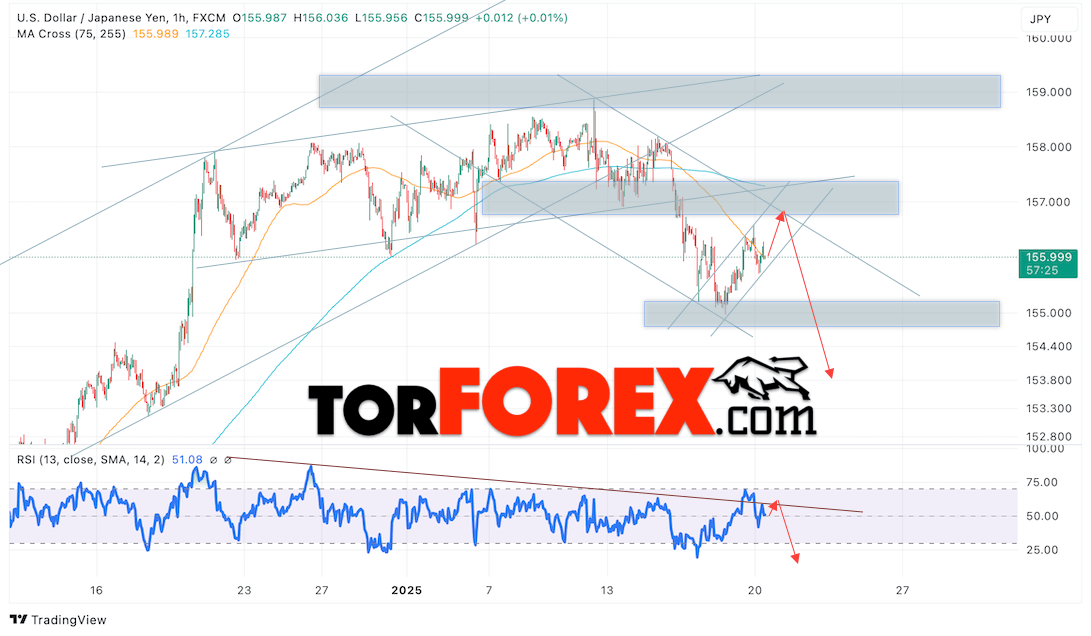 Котировки валютной пары Доллар Иена USDJPY продолжают движение в рамках развития бычьей коррекции и нисходящего канала. В момент публикации прогноза курс Доллара США к Японской Иене составляет 155.99. Скользящие средние указывают на наличие краткосрочной медвежьей тенденции по паре. Цены вновь тестируют область между сигнальными линиями, что указывает на давление со стороны продавцов Доллара США и потенциальное продолжение падения цен уже с текущих уровней. В рамках прогноза курса Японской Иены на 21 января 2025 стоит ожидать попытку развития подъёма цены и тест области сопротивления вблизи уровня 156.65. Далее, отскок цены вниз и продолжение падения пары USD/JPY в область ниже уровня 153.85.
