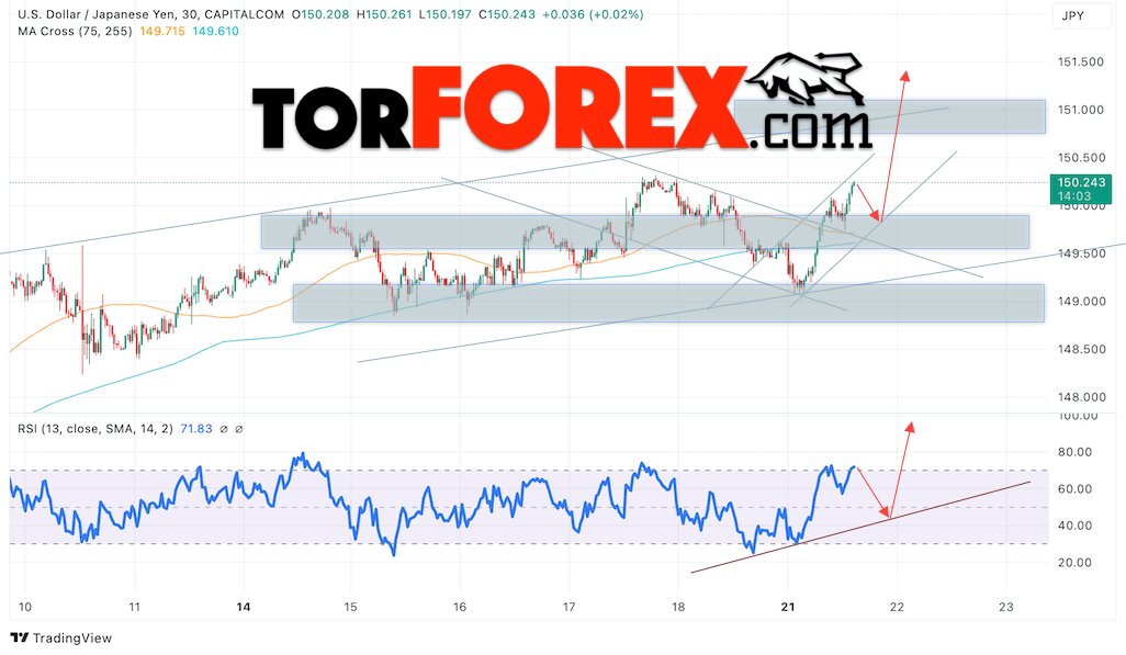 Дополнительным сигналом в пользу роста валютной пары USD/JPY выступит тест бычьей линии тренда на индикаторе относительной силы. Вторым сигналом станет отскок от нижней границы восходящего канала. Отменой варианта подъёма валютной пары Доллар Иена станет падение и пробой уровня 149.05. Это укажет на пробой области поддержки и продолжение снижения валютной пары Доллар Иена. В этом случае стоит ожидать продолжения падения пары в область ниже отметки 147.45. Ожидать подтверждения росту цены стоит с пробоем уровня сопротивления и закреплением цены выше уровня 152.55, что укажет на пробой верхней границы бычьего канала.