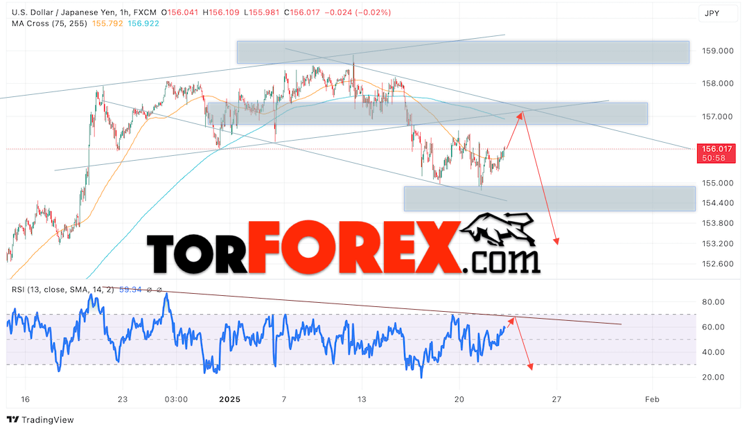 Котировки валютной пары Доллар Иена USDJPY продолжают движение в рамках развития боковой коррекции и нисходящего канала. В момент публикации прогноза курс Доллара США к Японской Иене составляет 156.01. Скользящие средние указывают на наличие краткосрочной медвежьей тенденции по паре. Цены продолжают тестировать область между сигнальными линиями, что указывает на давление со стороны продавцов Доллара США и потенциальное продолжение падения цен уже с текущих уровней. В рамках прогноза курса Японской Иены на 23 января 2025 стоит ожидать попытку развития роста цены и тест области сопротивления вблизи уровня 157.05. Далее, отскок цены вниз и продолжение падения пары USD/JPY в область ниже уровня 153.25.
