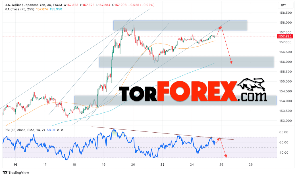 Котировки валютной пары Доллар Иена USDJPY продолжают движение в рамках развития коррекции и покинули пределы восходящего канала. Сохраняется потенциал для формирования разворотной модели «Двойная вершина». В момент публикации прогноза курс Доллара США к Японской Иене составляет 157.29. Скользящие средние указывают на наличие краткосрочной бычьей тенденции по паре. Цены пробили область между сигнальными линиями вверх, что указывает на давление со стороны покупателей Доллара США и потенциальное продолжение роста цен уже с текущих уровней. В рамках прогноза курса Японской Иены на 26 декабря 2024 стоит ожидать попытку развития подъёма цены и тест области сопротивления вблизи уровня 157.65. Далее, отскок цены вниз и продолжение падения пары USD/JPY в область ниже уровня 156.25.