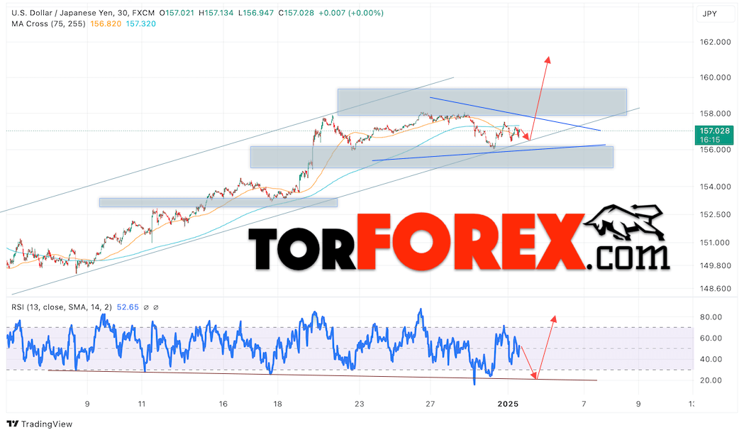 Котировки валютной пары Доллар Иена USDJPY продолжают движение в рамках развития роста и формирования модели «Треугольник». В момент публикации прогноза курс Доллара США к Японской Иене составляет 157.02. Скользящие средние указывают на наличие краткосрочной медвежьей тенденции по паре. Цены вновь тестируют область между сигнальными линиями, что указывает на давление со стороны продавцов Доллара США и потенциальное продолжение падения цен уже с текущих уровней. В рамках прогноза курса Японской Иены на 3 января 2025 стоит ожидать попытку развития снижения цены и тест области поддержки вблизи уровня 156.75. Далее, отскок цены вверх и продолжение роста пары USD/JPY в область выше уровня 160.65.