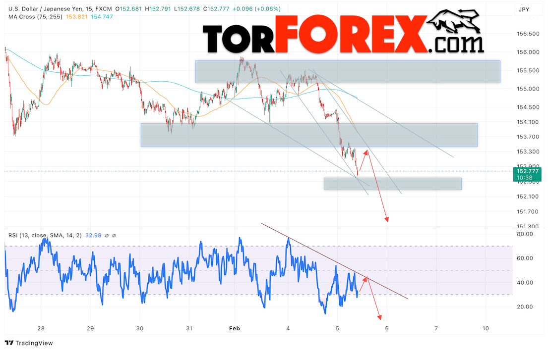 Котировки валютной пары Доллар Иена USDJPY продолжают движение в рамках развития падения и нисходящего канала. В момент публикации прогноза курс Доллара США к Японской Иене составляет 152.27. Скользящие средние указывают на наличие краткосрочной медвежьей тенденции по паре. Цены пробили область между сигнальными линиями вниз, что указывает на давление со стороны покупателей Доллара США и потенциальное продолжение роста цен уже с текущих уровней. В рамках прогноза курса Японской Иены на 6 февраля 2025 стоит ожидать попытку развития бычьей коррекции цены и тест области сопротивления вблизи уровня 153.35. Далее, отскок цены вниз и продолжение падения пары USD/JPY в область ниже уровня 151.85.