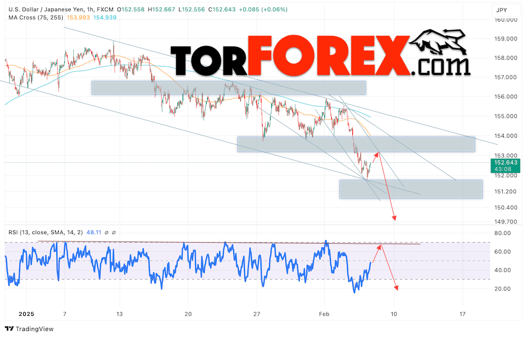 Котировки валютной пары Доллар Иена USDJPY продолжают движение в рамках развития незначительной коррекции и нисходящего канала. В момент публикации прогноза курс Доллара США к Японской Иене составляет 152.64. Скользящие средние указывают на наличие краткосрочной медвежьей тенденции по паре. Цены пробили область между сигнальными линиями вниз, что указывает на давление со стороны покупателей Доллара США и потенциальное продолжение роста цен уже с текущих уровней. В рамках прогноза курса Японской Иены на 7 февраля 2025 стоит ожидать попытку развития бычьей коррекции цены и тест области сопротивления вблизи уровня 153.05. Далее, отскок цены вниз и продолжение падения пары USD/JPY в область ниже уровня 149.70.