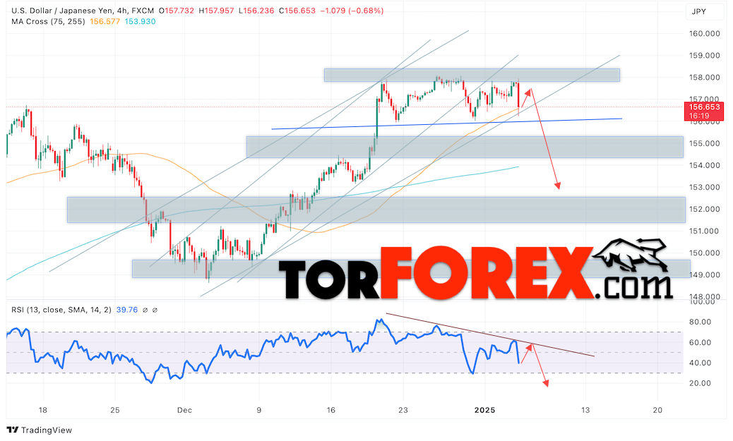 Котировки валютной пары Доллар Иена USDJPY продолжают движение в рамках развития падения и формирования разворотной модели «Голова и плечи». В момент публикации прогноза курс Доллара США к Японской Иене составляет 156.65. Скользящие средние указывают на наличие краткосрочной бычьей тенденции по паре. Цены пробили область между сигнальными линиями вверх, что указывает на давление со стороны покупателей Доллара США и потенциальное продолжение падения цен уже с текущих уровней. В рамках прогноза курса Японской Иены на 7 января 2025 стоит ожидать попытку развития роста цены и тест области сопротивления вблизи уровня 157.65. Далее, отскок цены вниз и продолжение падения пары USD/JPY в область ниже уровня 153.05.