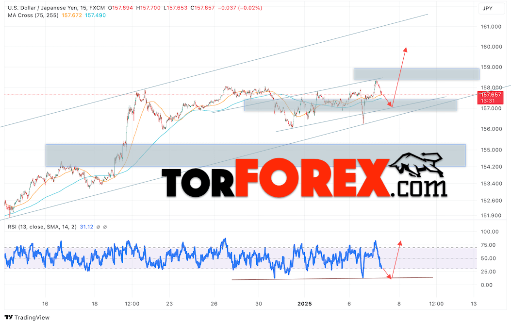 Котировки валютной пары Доллар Иена USDJPY продолжают движение в рамках развития роста и бычьего канала. В момент публикации прогноза курс Доллара США к Японской Иене составляет 157.65. Скользящие средние указывают на наличие краткосрочной бычьей тенденции по паре. Цены пробили область между сигнальными линиями вверх, что указывает на давление со стороны покупателей Доллара США и потенциальное продолжение падения цен уже с текущих уровней. В рамках прогноза курса Японской Иены на 8 января 2025 стоит ожидать попытку развития падения цены и тест области поддержки вблизи уровня 157.15. Далее, отскок цены вверх и продолжение роста пары USD/JPY в область выше уровня 159.05.