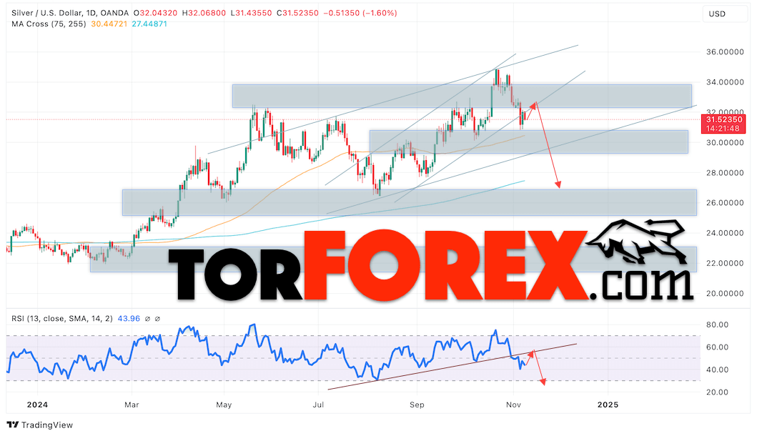 Дополнительным сигналом в пользу снижения котировок и цен на Серебро XAGUSD выступит тест линии сопротивления на индикаторе относительной силы (RSI). Вторым сигналом в пользу падения станет отскок от нижней границы бычьего канала. Отменой варианта падения цен на Серебро 11 — 15 ноябрь 2024 станет сильный рост и пробой 34.15. Это укажет на пробой области сопротивления и продолжение роста в область выше уровня 36.25. Ожидать подтверждения падению котировок XAGUSD стоит с пробоем области поддержки и закрытием цены под уровнем 29.65, что укажет на пробой нижней границы бычьего канала.