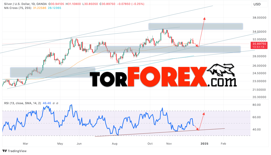 Дополнительным сигналом в пользу снижения котировок и цен на Серебро XAGUSD выступит тест линии сопротивления на индикаторе относительной силы (RSI). Вторым сигналом в пользу падения станет отскок от нижней границы бычьего канала. Отменой варианта падения цен на Серебро 16 — 20 декабря 2024 станет сильный рост и пробой 34.15. Это укажет на пробой области сопротивления и продолжение роста в область выше уровня 36.25. Ожидать подтверждения падению котировок XAGUSD стоит с пробоем области поддержки и закрытием цены под уровнем 29.65, что укажет на пробой нижней границы бычьего канала.