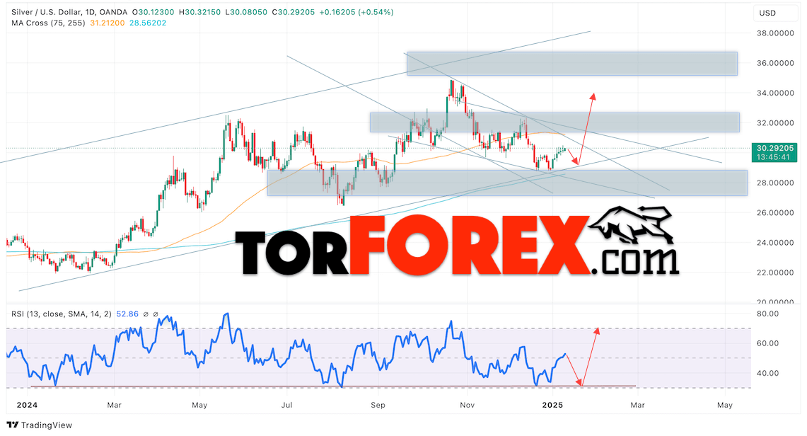 Дополнительным сигналом в пользу подъёма котировок и цен на Серебро XAGUSD выступит тест линии бычьей линии тренда на индикаторе относительной силы (RSI). Вторым сигналом в пользу роста станет отскок от нижней границы бычьего канала. Отменой варианта подъёма цен на Серебро 13 — 17 января 2025 станет падение и пробой 27.65. Это укажет на пробой области сопротивления и продолжение роста в область выше уровня 24.55. Ожидать подтверждения росту котировок XAGUSD стоит с пробоем области сопротивления и закрытием цены над уровнем 32.35, что укажет на пробой верхней границы нисходящего канала коррекции.