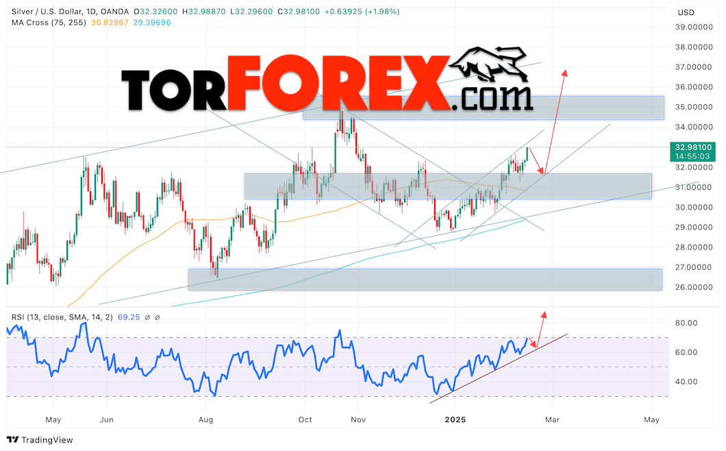 Дополнительным сигналом в пользу подъёма котировок и цен на Серебро XAGUSD выступит тест бычьей линии тренда на индикаторе относительной силы (RSI). Вторым сигналом в пользу роста станет отскок от нижней границы восходящего канала. Отменой варианта подъёма цен на Серебро 17 — 21 февраля 2025 станет падение и пробой 30.90. Это укажет на пробой области сопротивления и продолжение роста в область выше уровня 29.15. Ожидать подтверждения росту котировок XAGUSD стоит с пробоем области сопротивления и закрытием цены над уровнем 33.45.