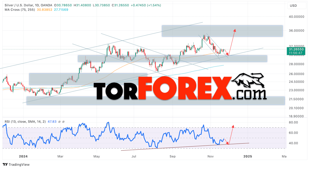 Дополнительным сигналом в пользу подъёма котировок и цен на Серебро XAGUSD выступит тест линии поддержки на индикаторе относительной силы (RSI). Вторым сигналом в пользу роста станет отскок от нижней границы бычьего канала. Отменой варианта роста цен на Серебро 25 — 29 ноября 2024 станет падения и пробой 27.85. Это укажет на пробой области поддержки и продолжение падения в область ниже уровня 25.65. Ожидать подтверждения роста котировок XAGUSD стоит с пробоем области сопротивления и закрытием цены над уровнем 32.35.