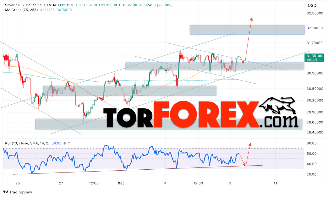 Дополнительным сигналом в пользу подъёма котировок и цен на Серебро XAG/USD выступит тест линии поддержки на индикаторе относительной силы (RSI). Вторым сигналом в пользу подъёма станет отскок от нижней границы бычьего канала. Отменой варианта роста цен на Серебро 10 декабря 2024 станет падение и пробой 30.65. Это укажет на пробой области поддержки и продолжение падения в область ниже уровня 29.35. Ожидать ускорения роста котировок XAGUSD стоит с пробоем области сопротивления и закрытием цены над уровнем 31.65, что укажет на пробой верхней границы нисходящего канала коррекции.