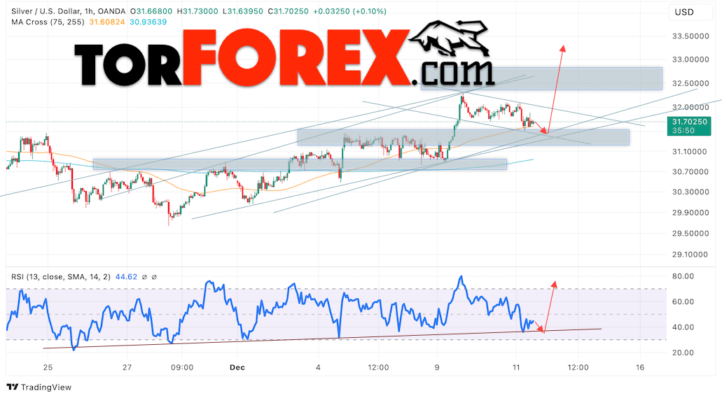 Дополнительным сигналом в пользу подъёма котировок и цен на Серебро XAG/USD выступит тест линии поддержки на индикаторе относительной силы (RSI). Вторым сигналом в пользу подъёма станет отскок от нижней границы бычьего канала. Отменой варианта роста цен на Серебро 12 декабря 2024 станет падение и пробой 31.05. Это укажет на пробой области поддержки и продолжение падения в область ниже уровня 29.65. Ожидать ускорения роста котировок XAGUSD стоит с пробоем области сопротивления и закрытием цены над уровнем 32.35, что укажет на пробой верхней границы нисходящего канала коррекции.
