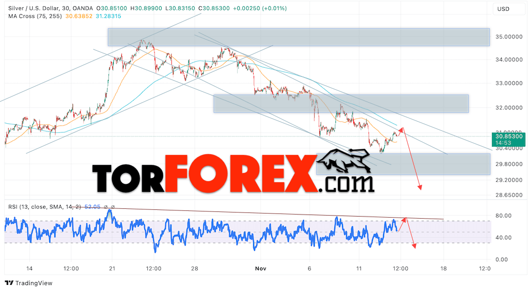 Дополнительным сигналом в пользу снижения котировок и цен на Серебро XAG/USD выступит тест линии сопротивления на индикаторе относительной силы (RSI). Вторым сигналом в пользу падения станет отскок от верхней границы нисходящего канала. Отменой варианта падения цен на Серебро 14 ноября 2024 станет сильный рост и пробой 31.75. Это укажет на пробой области сопротивления и продолжение роста в область выше уровня 33.15. Ожидать ускорения падения котировок XAGUSD стоит с пробоем области поддержки и закрытием цены под уровнем 29.75.