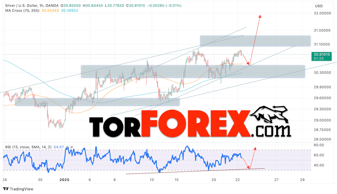 Дополнительным сигналом в пользу подъёма котировок и цен на Серебро XAG/USD выступит тест линии поддержки на индикаторе относительной силы (RSI). Вторым сигналом в пользу роста станет отскок от нижней границы бычьего канала. Отменой варианта роста цен на Серебро 23 января 2025 станет падение и пробой 30.15. Это укажет на пробой области поддержки и продолжение падения в область ниже уровня 28.45. Ожидать ускорения роста котировок XAGUSD стоит с пробоем области сопротивления и закрытием цены над уровнем 31.05.