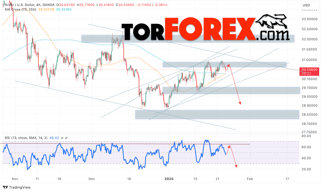 Дополнительным сигналом в пользу падения котировок и цен на Серебро XAG/USD выступит тест линии сопротивления на индикаторе относительной силы (RSI). Вторым сигналом в пользу роста станет отскок от верхней границы медвежьего канала. Отменой варианта падения цен на Серебро 24 января 2025 станет сильный рост и пробой 31.45. Это укажет на пробой области сопротивления и продолжение роста в область выше уровня 32.65. Ожидать ускорения падения котировок XAGUSD стоит с пробоем области поддержки и закрытием цены под уровнем 29.55, что укажет на пробой нижней границы бычьего канала коррекции.