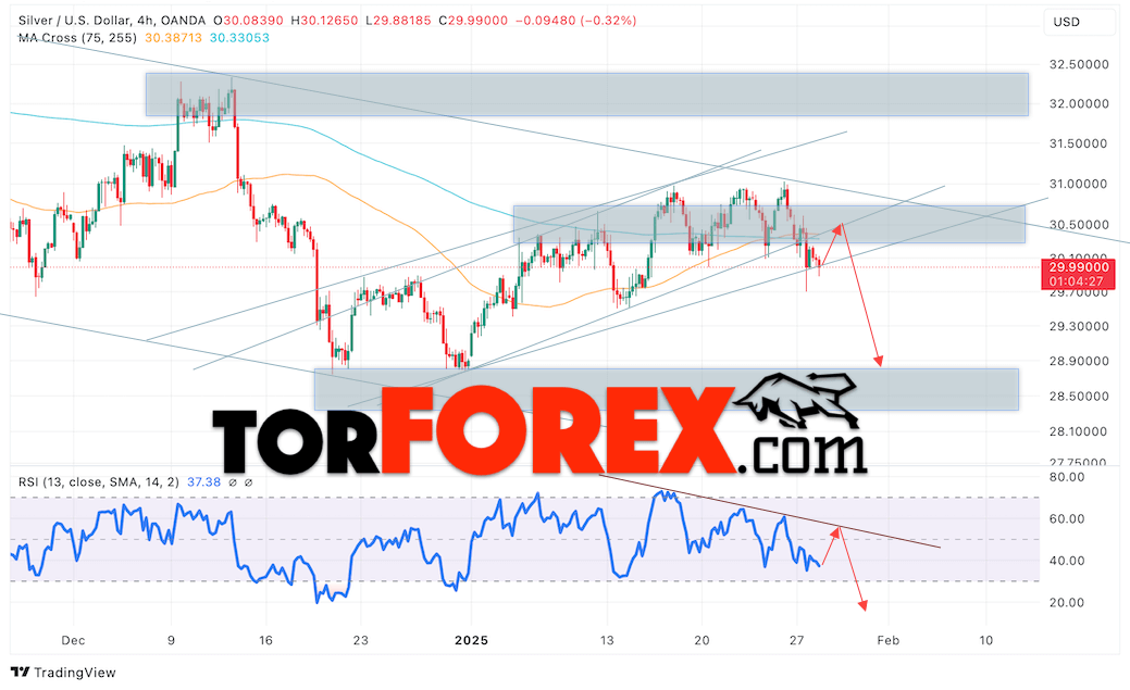 Дополнительным сигналом в пользу падения котировок и цен на Серебро XAG/USD выступит тест линии сопротивления на индикаторе относительной силы (RSI). Вторым сигналом в пользу роста станет отскок от нижней границы бычьего канала, который был пробит продавцами вниз. Отменой варианта падения цен на Серебро 29 января 2025 станет сильный рост и пробой 31.45. Это укажет на пробой области сопротивления и продолжение роста в область выше уровня 33.05. Ожидать ускорения падения котировок XAGUSD стоит с пробоем области поддержки и закрытием цены под уровнем 29.55.