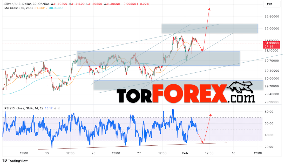 Дополнительным сигналом в пользу подъёма котировок и цен на Серебро XAG/USD выступит тест линии поддержки на индикаторе относительной силы (RSI). Вторым сигналом в пользу роста станет отскок от нижней границы бычьего канала. Отменой варианта подъёма цен на Серебро 5 февраля 2025 станет падение и пробой 30.65. Это укажет на пробой области поддержки и продолжение падения в область ниже уровня 29.45. Ожидать ускорения роста котировок XAGUSD стоит с пробоем области сопротивления и закрытием цены над уровнем 31.85.