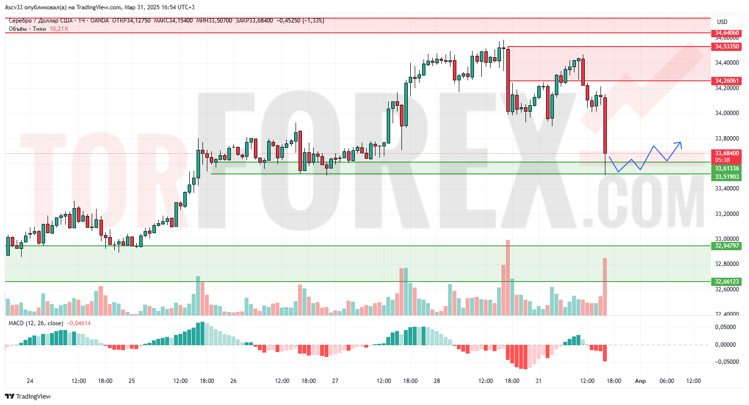 Цена серебра (XAG/USD) резко снизилась и в момент анализа торгуется на уровне $33,6840, потеряв более 1% за день. Это движение стало реакцией на пробой ключевой зоны поддержки, при этом на фоне всплеска объёма и ускорения снижения наблюдается потенциал формирования краткосрочной фазы накопления или отскока.