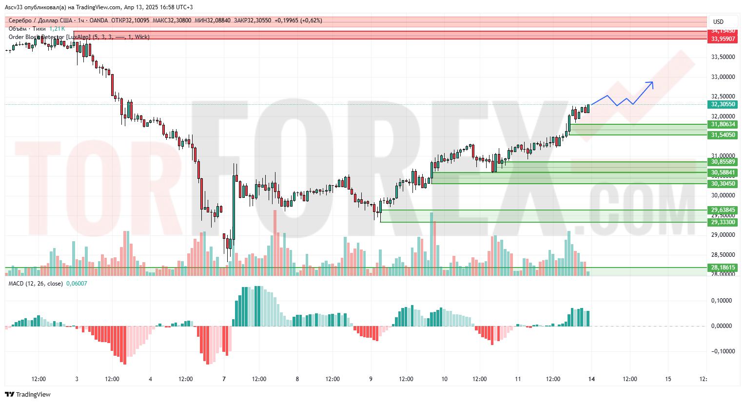 Серебро демонстрирует уверенный восходящий тренд после фазы накопления вблизи уровня $29. Сформирован четкий импульс роста, подтвержденный объемами и положительной динамикой MACD. Цена вышла за пределы сопротивления $31.80, и теперь идет закрепление выше.