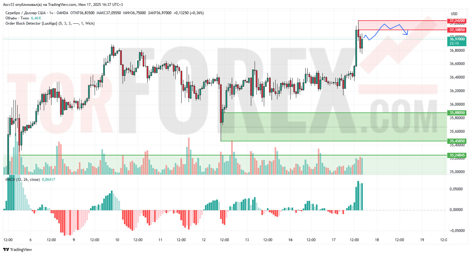 На фоне достижения зоны сопротивления вероятна локальная коррекция в направлении 36,70–36,50. Однако общая структура остаётся бычьей. При удержании выше 36,50 сценарий роста в область 37,24 и выше сохраняется. Пробой ниже 36,50 откроет путь к поддержке 35,88.