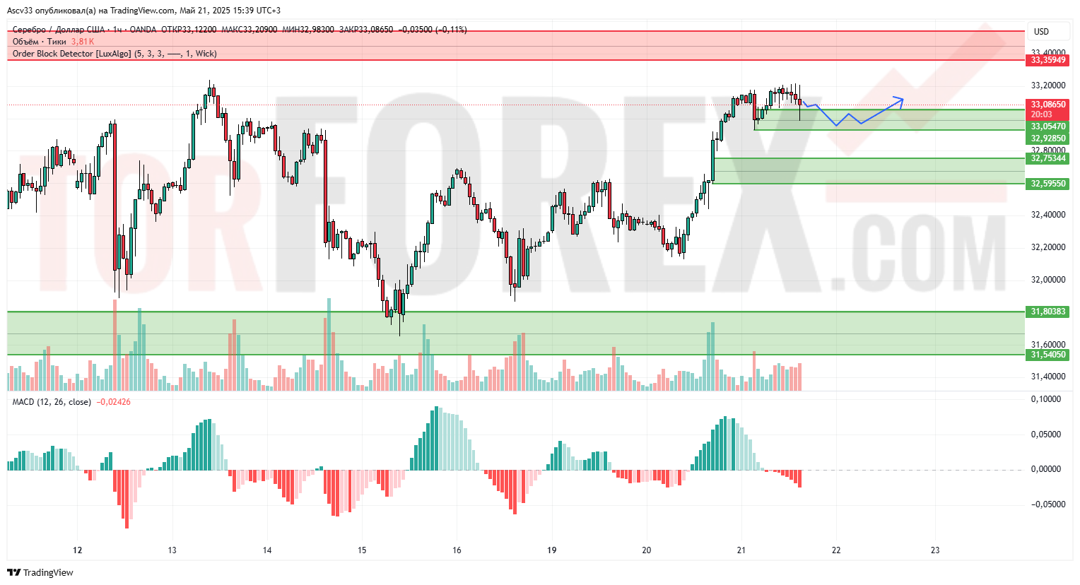 Ожидается движение в боковом диапазоне 32,95–33,20. Пробой ниже 32,95 откроет путь к 32,75 и далее к 32,59. В случае удержания уровня 33,00 и восстановления объёмов — возможен повторный подход к 33,36. Однако текущая динамика указывает на вероятную паузу в росте и флетовую структуру.