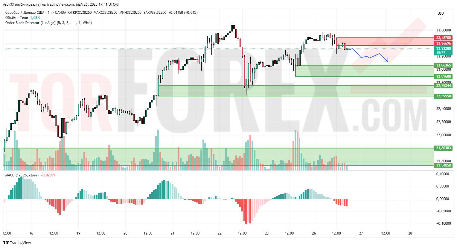 Пара XAG/USD (Серебро к доллару США) находится в фазе коррекции после достижения недавних максимумов. Текущая цена 33,322 USD торгуется ниже ближайшей зоны сопротивления, отмеченной красным цветом (33,486 — 33,700). На графике видно, что восходящее движение замедлилось, и цена формирует нисходящее движение или консолидацию после пробоя локальных уровней поддержки. Индикатор MACD находится в отрицательной зоне, и его гистограмма снижается, что указывает на преобладание медвежьих настроений и возможное продолжение снижения. Объемы торгов остаются умеренными.