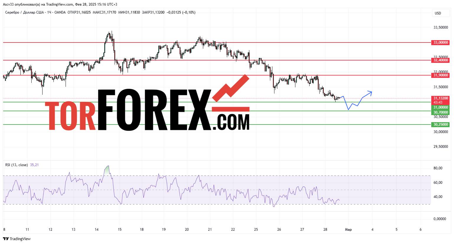 - Уровни поддержки: $31,00, $30,70, $30,25
