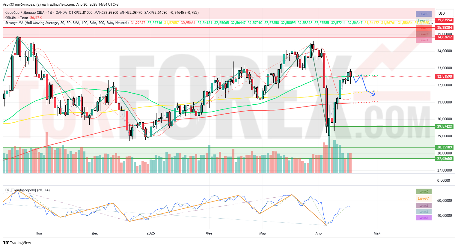 - При пробое локальной поддержки на уровне 32 долларов серебро может устремиться к следующей цели на уровне 31,5 долларов.