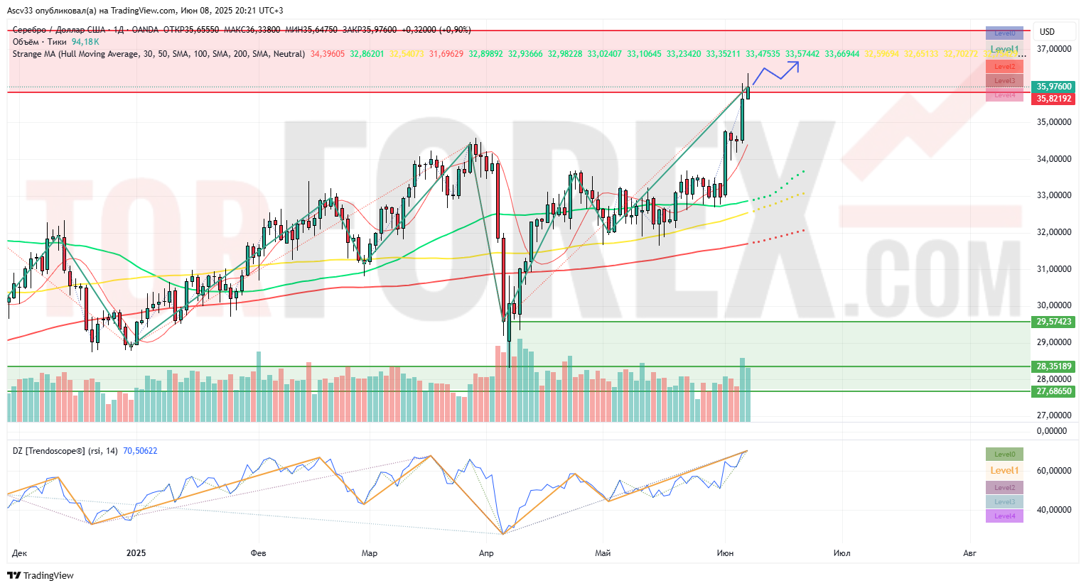 Серебро демонстрирует сильную бычью динамику, и при сохранении импульса возможен пробой $35,80 с переходом в зону $36,40+. Однако из-за RSI в зоне перекупленности не исключён технический откат.