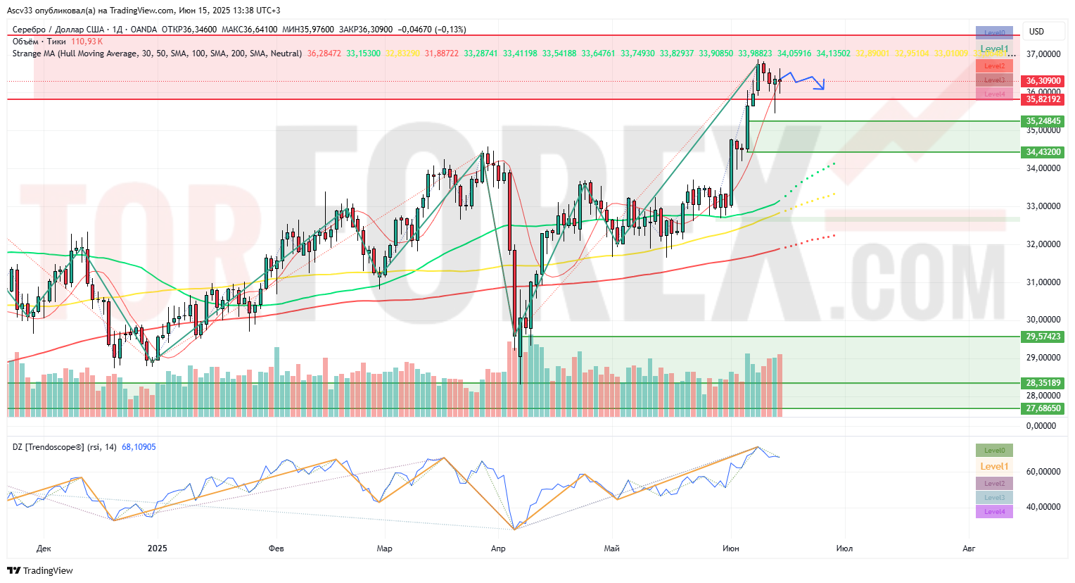 Серебро сохраняет восходящий тренд, но текущая зона насыщена продавцами. Учитывая перекупленность по RSI, возможно временное замедление роста или коррекция к ближайшей поддержке.